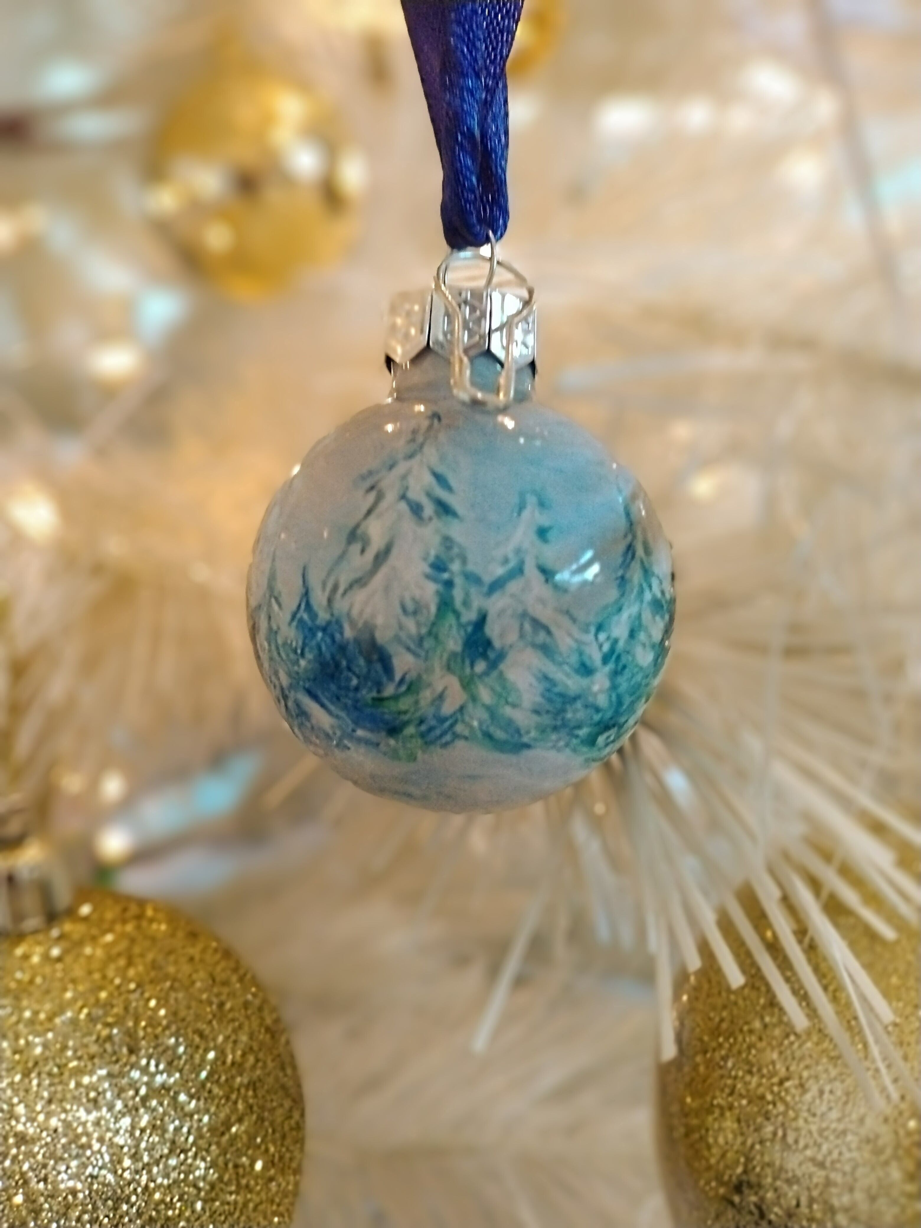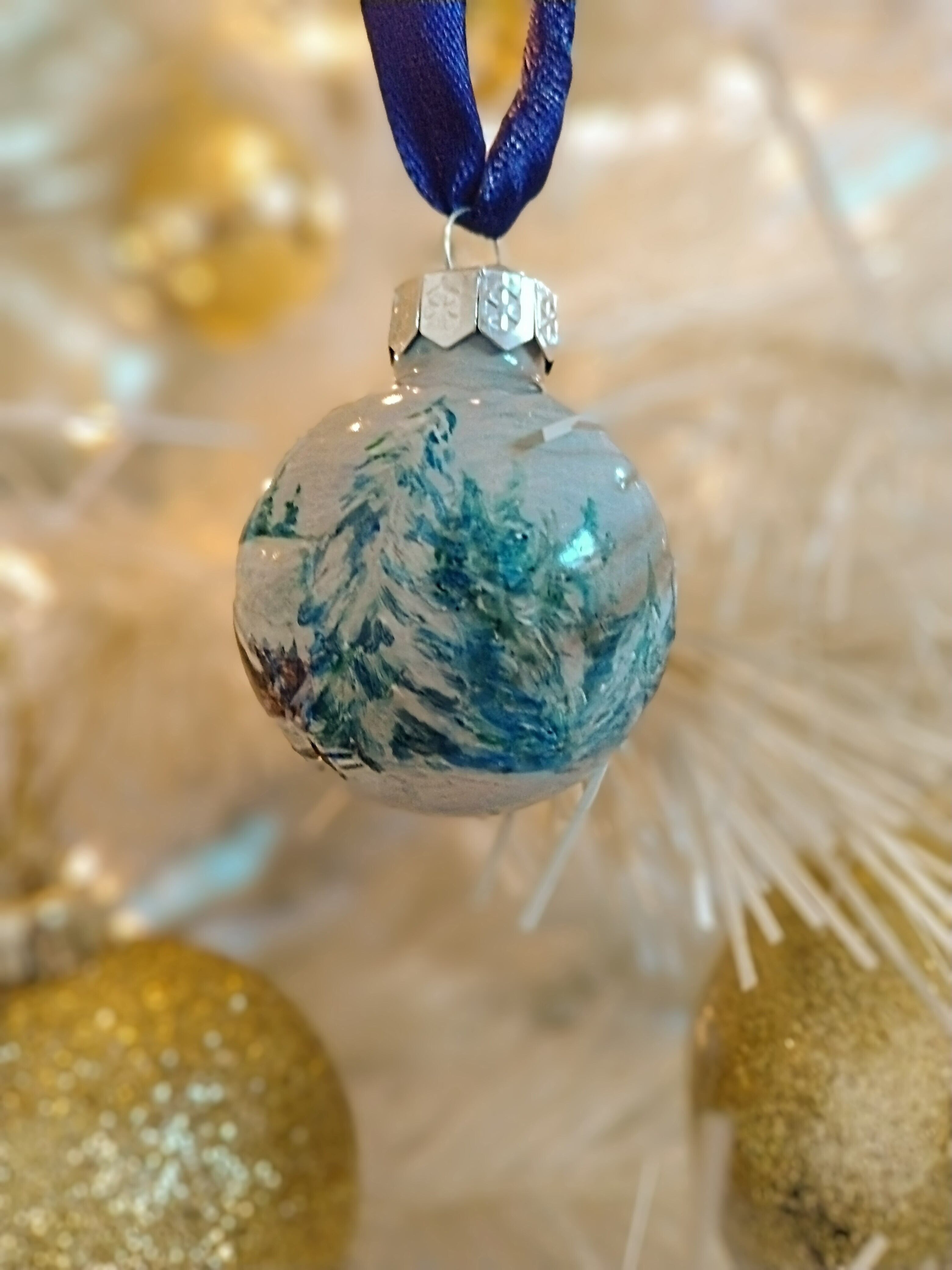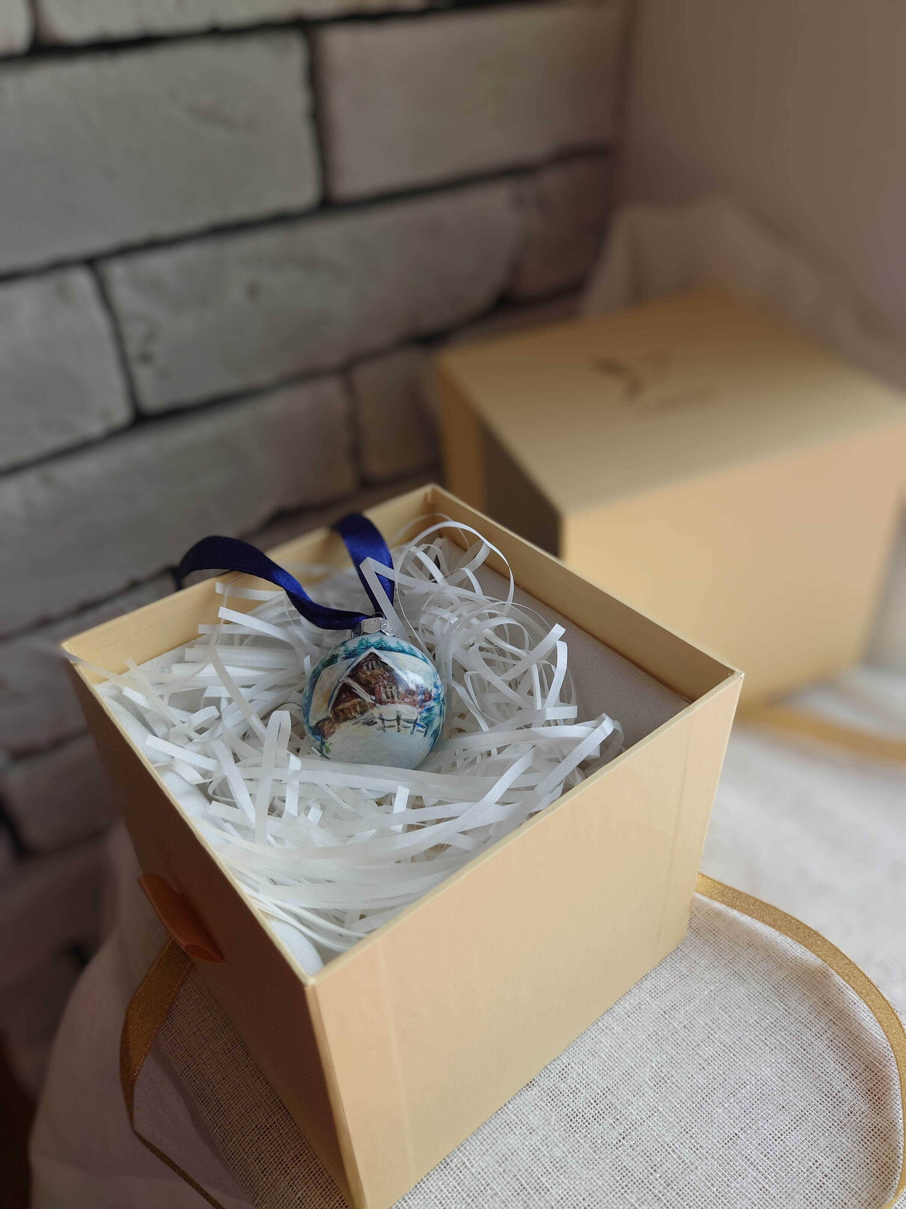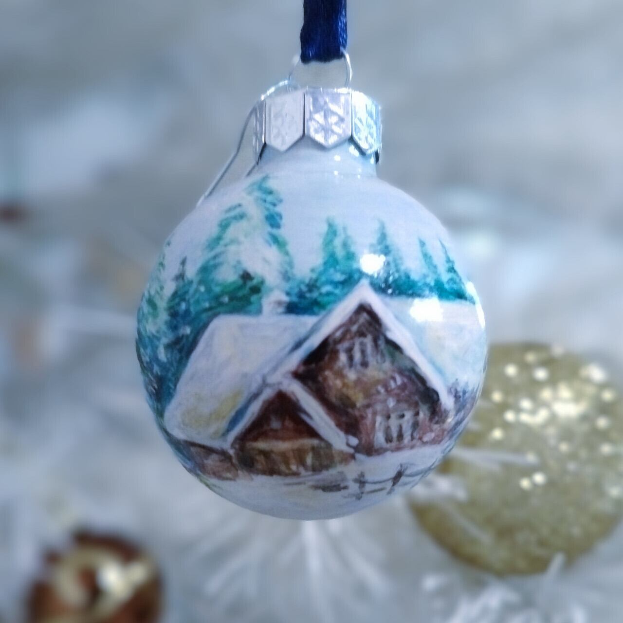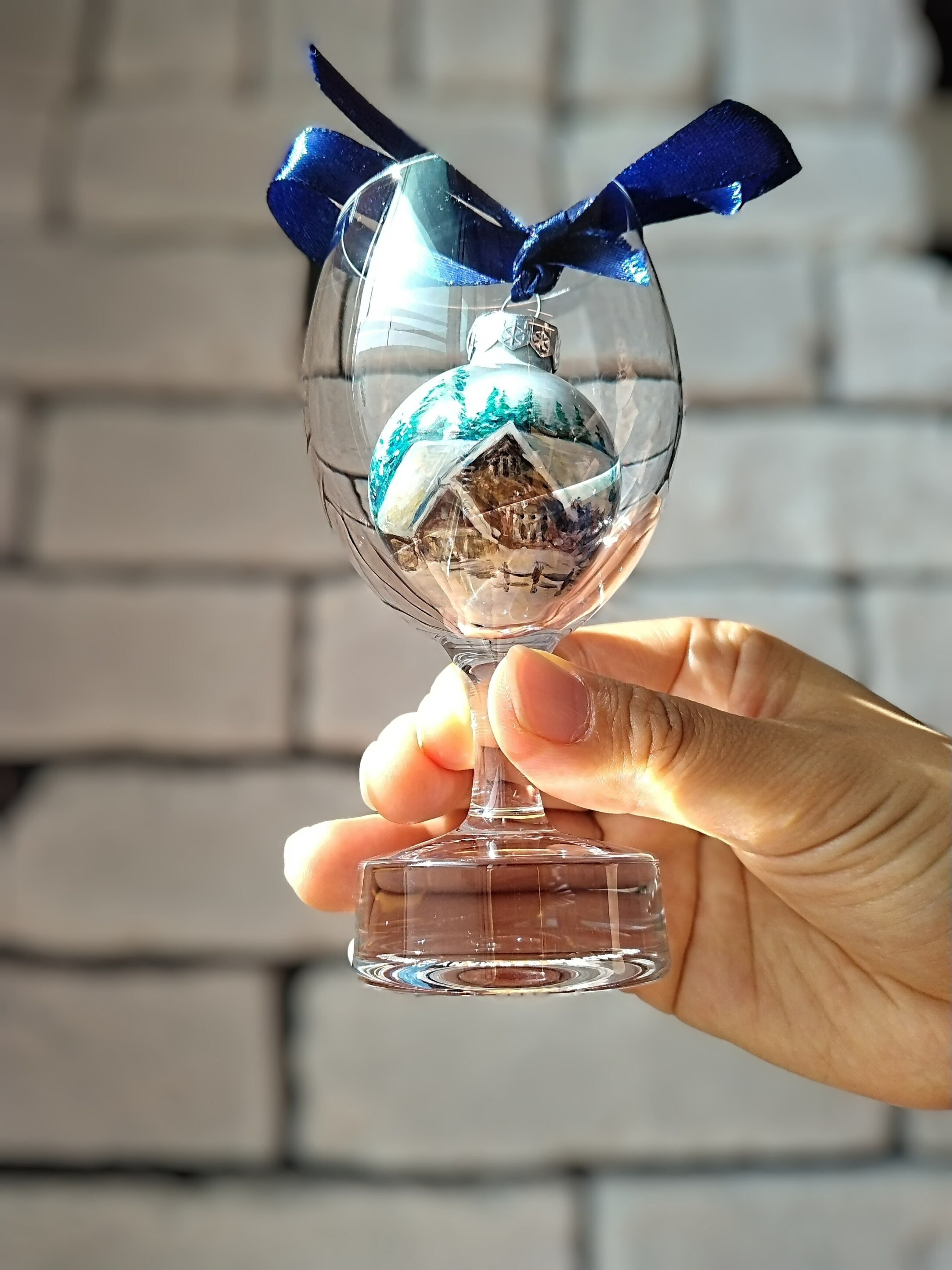 直径4cmのこのガラス製のオーナメントは、雪に覆われた可愛らしい民家のデザインが施されており、見る者の心が心躍る様なきれいな雪景色となっております。冬のインテリアやクリスマスツリーの飾り付けにぴったりで、上品さと温かみ、そして華やかさをもたらします。作成数は世界で1つだけであり、お友達やご家族への贈り物にも喜ばれるアイテムです。