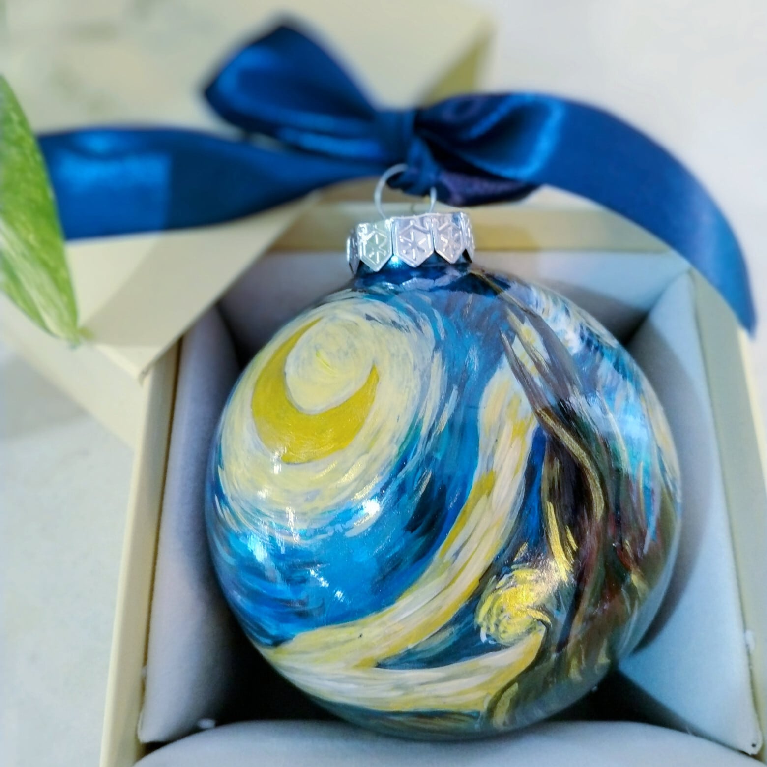 幻想的な月夜のデザインが施された直径10cmのガラス製オーナメント。ゴッホの「星月夜」をモチーフとしています。大きく存在感も抜群で、そのアーティスティックな雰囲気はクリスマスシーズンはもちろん、普段のインテリアとしても多彩に活躍するアイテムです。作成数は世界で1つだけであり、他にはない特別な飾りを求める方におすすめです。